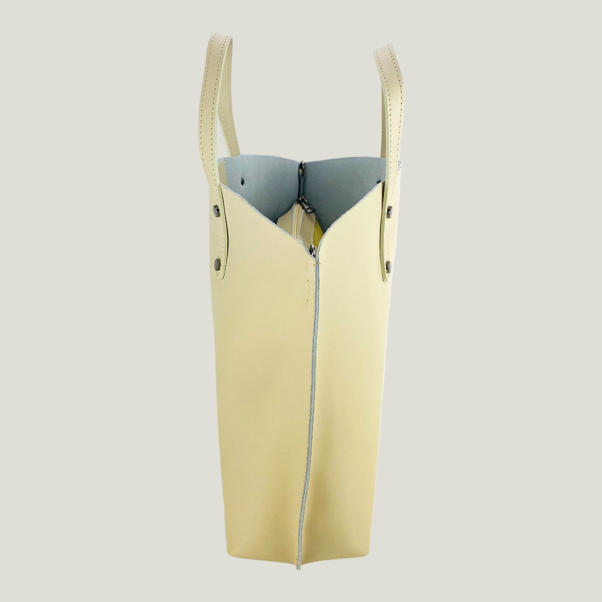 Wie alle Modelle dieser Kollektion wird auch die beige Variante in Italien aus hochwertigem Vachetta-Echtleder gefertigt. Die Oberfläche zeigt eine feine Struktur, während die Form klassisch und modern zugleich wirkt.