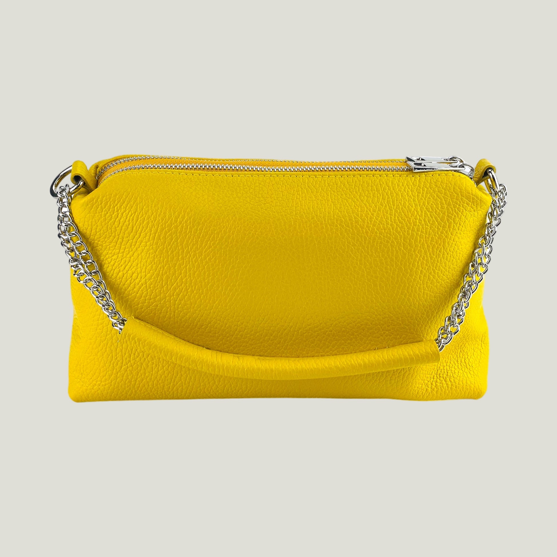 Diese elegante Handtasche aus Echtleder wird in Italien handgefertigt und besticht durch ihre hochwertige Verarbeitung sowie ihr raffiniertes Design. Die Farbe Giallo (Gelb) verleiht der Tasche einen frischen, fröhlichen und zugleich modischen Akzent – ideal, um jedes Outfit stilvoll aufzuhellen.