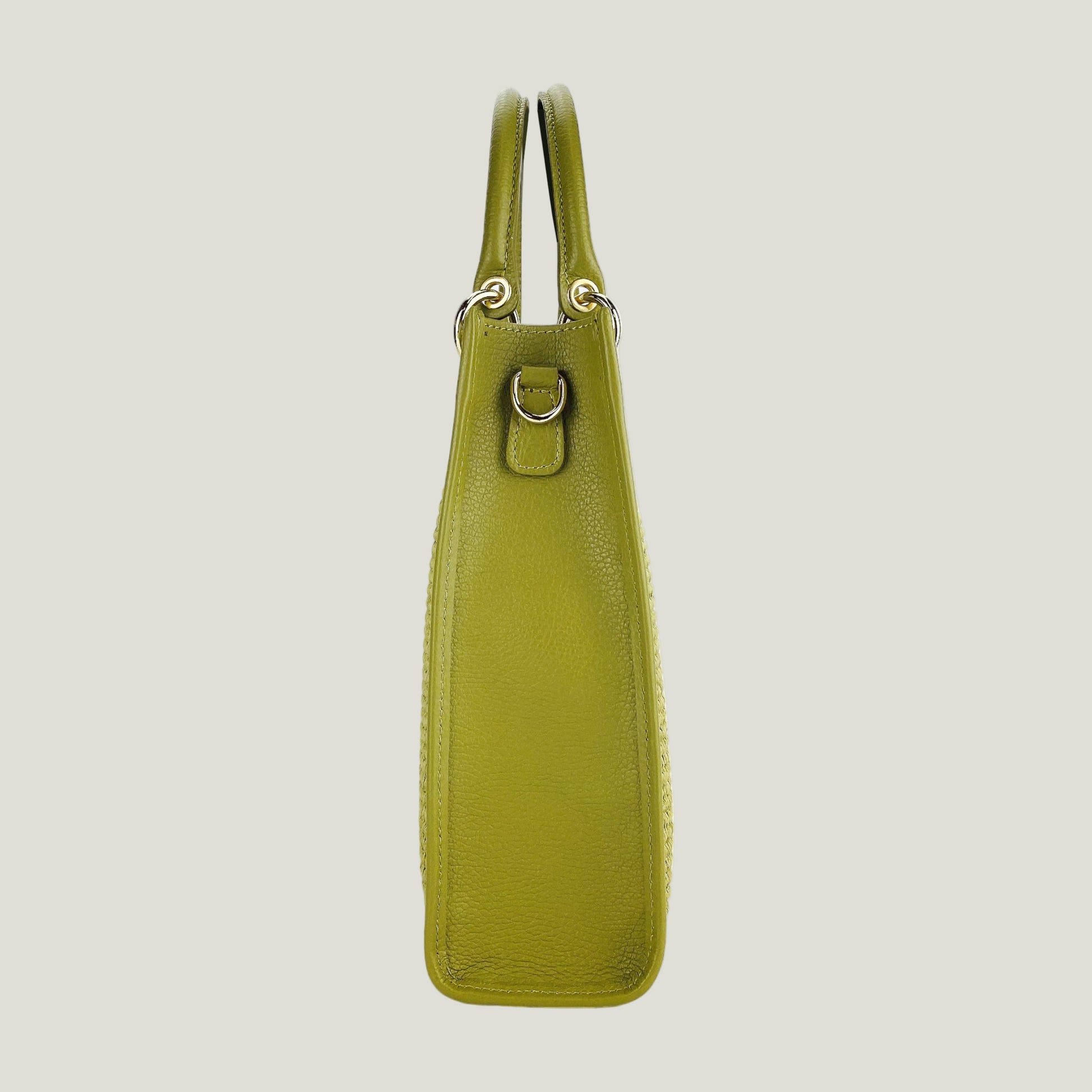 Diese vertikale Damen-Handtasche Made in Italy wurde aus hochwertigem echtem Leder gefertigt und handwerklich designt. Sie ist eine perfekte Begleiterin für jede Gelegenheit und jedes Outfit. Die Farbe Pistacchio unterstreicht ihren frischen, eleganten und modischen Look.